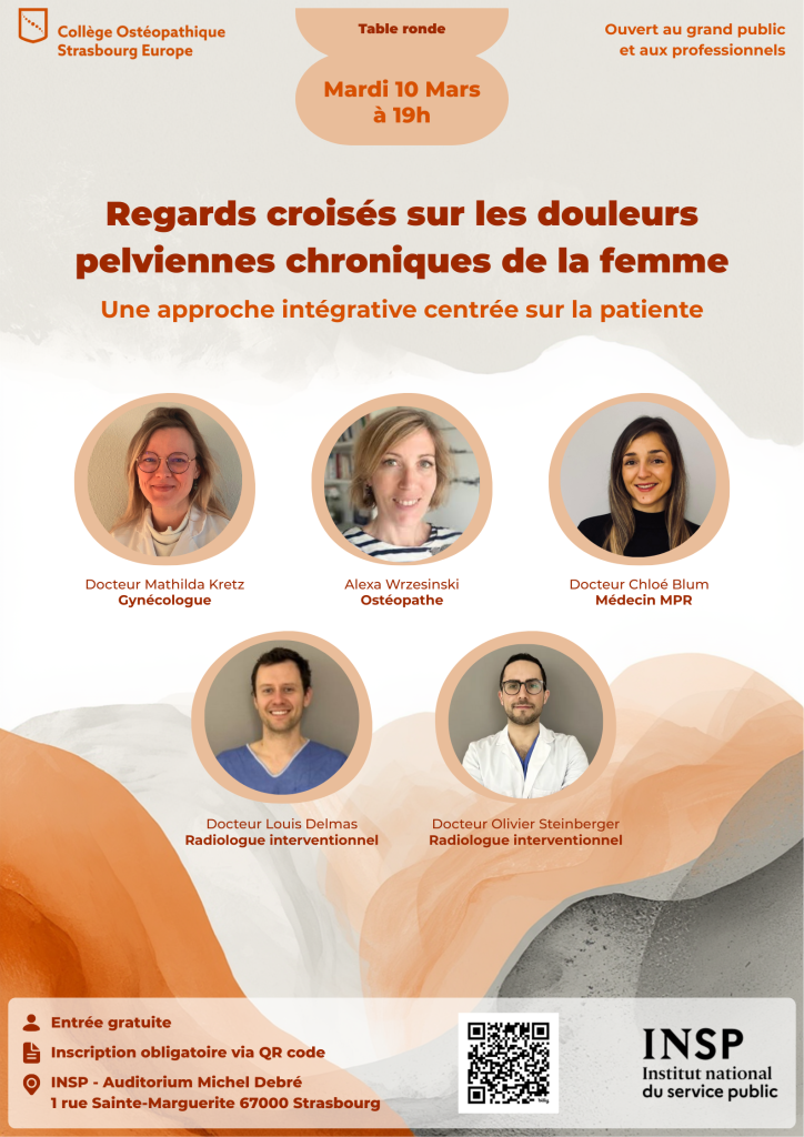 Les douleurs pelviennes chroniques touchent de nombreuses femmes et s’accompagnent souvent d’une errance thérapeutique liée à la multiplicité et à la complexité de leurs causes. Cette rencontre sera l’occasion d’échanger autour du parcours de soin et de l’accompagnement des patientes, et de favoriser la collaboration interprofessionnelle. Nous allons démontrer l’intérêt d’une prise en charge pluridisciplinaire. Cet évènement est destiné au grand public ainsi qu’aux professionnels de santé.
